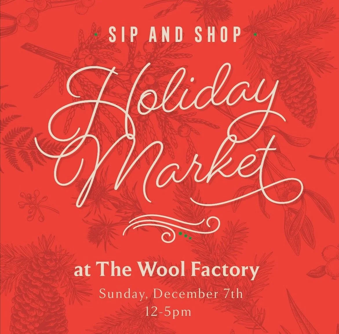 It’s almost that time of year again! Join us for the 5th Annual Holiday Market at The Wool Factory. Shop, sip, and celebrate the season with more than 15 local artisans and vendors. Admission is free, parking is plentiful, and our indoor market is warm and welcoming for all ages. Enjoy festive drinks and a special holiday menu.