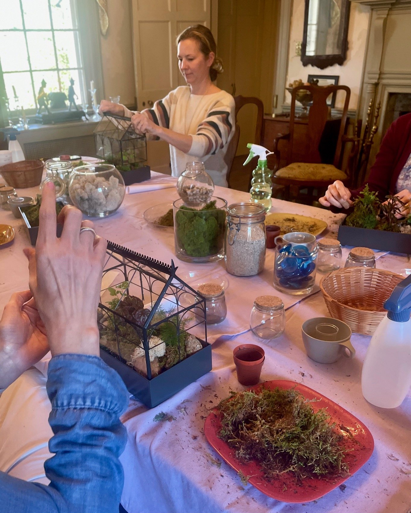 Join us for a hands-on experience creating your own miniature indoor garden in a glass terrarium case reminiscent of English conservatories of the nineteen century. The stunning, premium quality terrarium case designed for long-lasting durability includes brass filigree trim and brass finials. The case is 9.5”L x 5.5”W x 10.5” making it the perfect size for any location. And the entire glass terrarium top lifts off for easy care and planting.