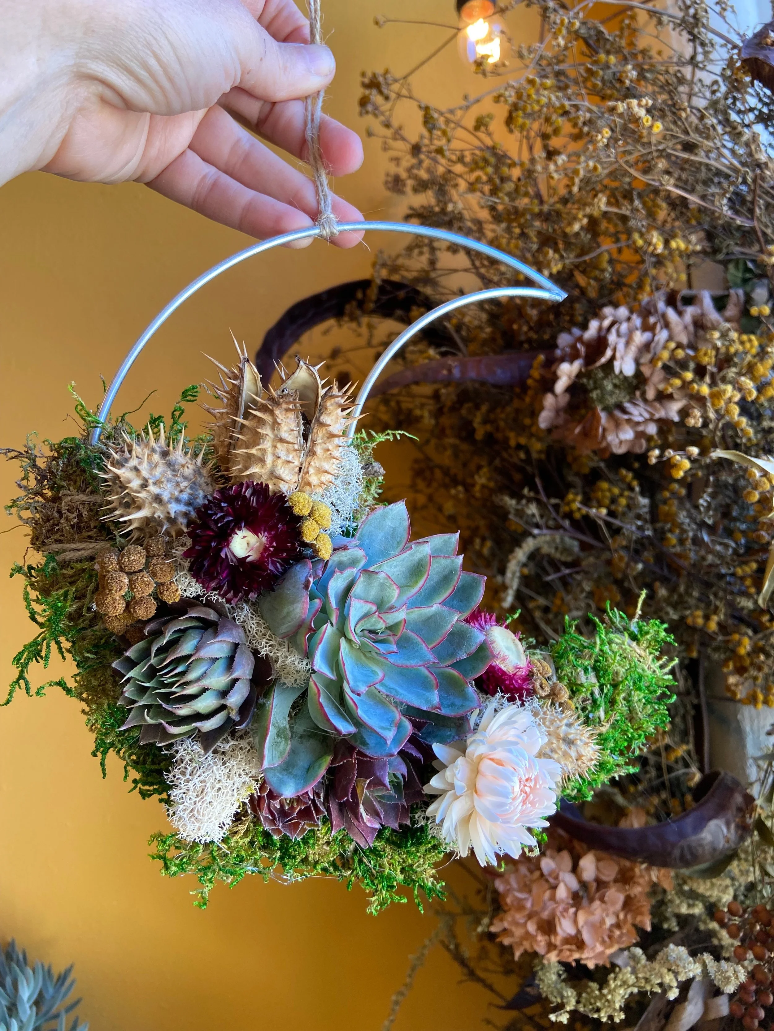 Registration includes instruction, 8 inch crescent moon frame, a variety of succulent cuttings and an airplant, dried flowers and decorative moss. All materials and tools will be provided. Just bring your creativity and love of plants.